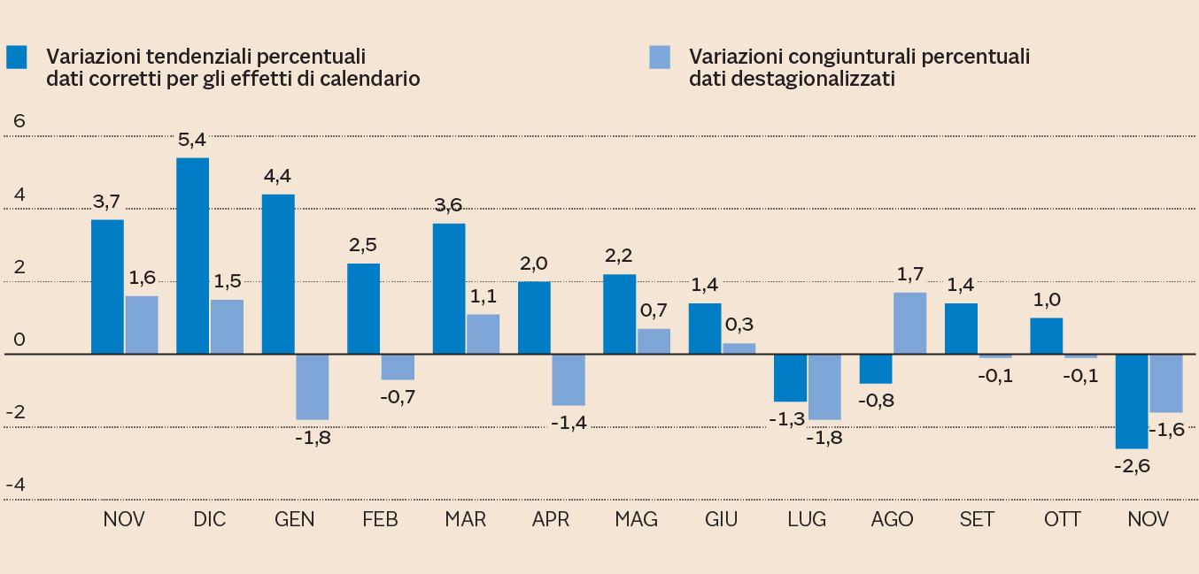 Il premier Conte: “Mi attendevo e temevo un dato negativo come in Europa”. L’indice è diminuito in termini tendenziali del 2,6%. Crolla il settore auto che sfiora una discesa del 20%. Moderata crescita tendenziale solo per i beni di consumo (+0,7%); in calo beni intermedi (-5,3%) ed energia (-4,2%)