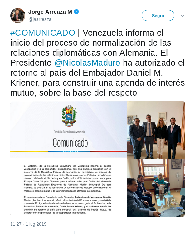 “Il Venezuela segnala l’inizio del processo di normalizzazione delle relazioni diplomatiche con la Germania. Il presidente Nicolás Maduro ha autorizzato il ritorno dell’ambasciatore Daniel M. Kriener nel paese per costruire un programma di reciproco interesse, basato sul rispetto”, ha dichiarato il ministro degli Esteri Jorge Arreaza attraverso il suo account Twitter.